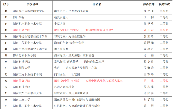 本届赛事覆盖全省110所高校,共有2200余件作品参赛。经学校申报、网络展示、专家评审等环节,学校参赛作品共获得奖项23项,其中我院参赛教师许正宜、罗达等5名教师荣获教师组二等奖,梁毅娜、张昕辉等6名教师荣获教师组二等奖。此外,我院刘洪波、颜福维等11名教师荣获“优秀指导教师”称号。在教师认真指导、学生积极配合之下,学生组收获颇丰。姚慧、张兴发和刘洪波老师指导的参赛作品《百年犹未老 世纪正青春》获得学生组特等奖,同时,其他参赛作品还荣获学生组一等奖1项、二等奖2项、三等奖7项,学校也获评“优秀组织奖”。