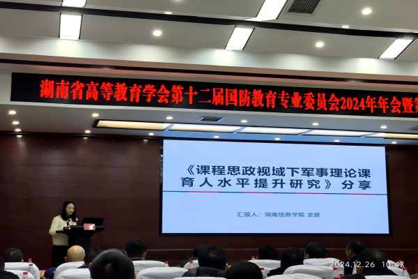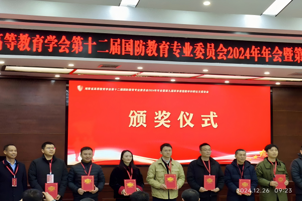 2024年12月26日,湖南省高等教育学会国防教育专业委员会2024年年会暨第九届军事课教学科研论文报告会于近日在风景秀丽的湘西吉首成功举办。本次会议由湘西民族职业技术学院承办,省内军事教育专家和学者纷纷参会。在这次学术盛会中,我院龙晋、李权老师撰写的《课程思政视域下高校军事理论课育人水平提升研究》一文脱颖而出,荣获论文一等奖,并在会上分享了其独特的论文写作和研究经验。