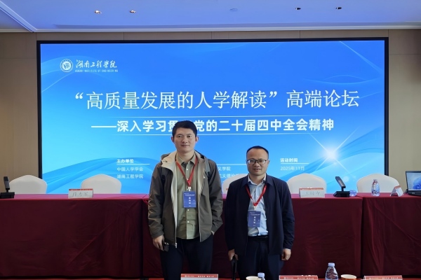 11月15日,中国人学学会“高质量发展的人学解读”高端论坛在湖南湘潭举办。本次论坛由湖南工程学院马克思主义学院承办,湖南工程学院副校长罗毅平,北京大学哲学系教授、中国人学学会会长丰子义先后致辞。论坛以“高质量发展的人学解读”为主题,对党的二十届四中全会精神进行了学理性解读和阐释。北京大学马克思主义学院院长、中国人学学会副会长仰海峰等数十位专家学者及青年教师进行了主题发言。我院董良副院长、苏同欢博士参加论坛,并进行学术交流。(文/图 苏同欢 一审/夏天鹰 二审/沈琪美 三审/刘洪波)
