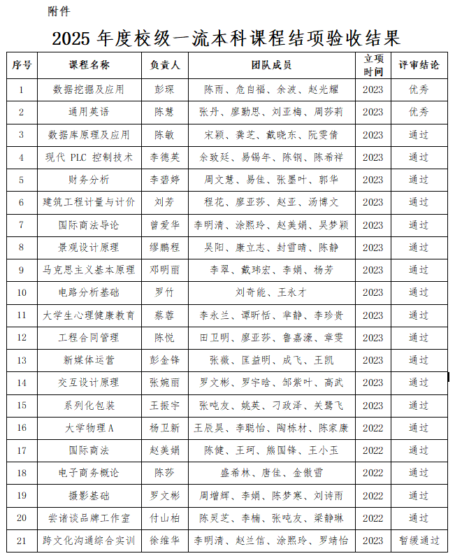 根据《关于开展2025年度校级一流本科课程结项认定工作的通知》(湘信院教务处〔2025〕202号)精神,由课程负责人申请、二级学院初审、教务处组织专家评审,经公示无异议,现将21门校级一流本科课程的结项验收评审结果予以公布(见附件)。